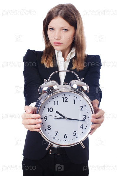 Бизнес-леди с часами, изолированная на белом фоне