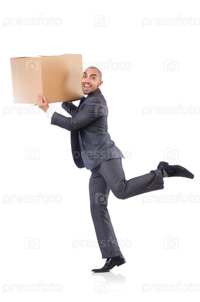 Бизнесмен с коробкой, изолированный на белом