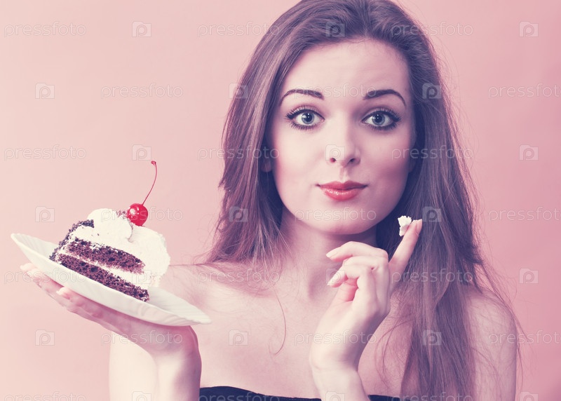 Красивая женщина держит кусок шоколадного торта