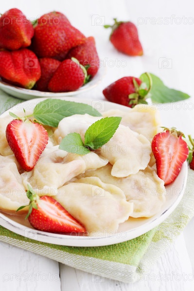 Пельмени с свежей клубникой, сливками и мятой