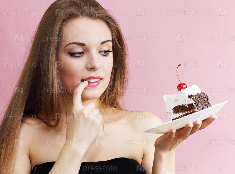 Красивая женщина держит кусок шоколадного торта