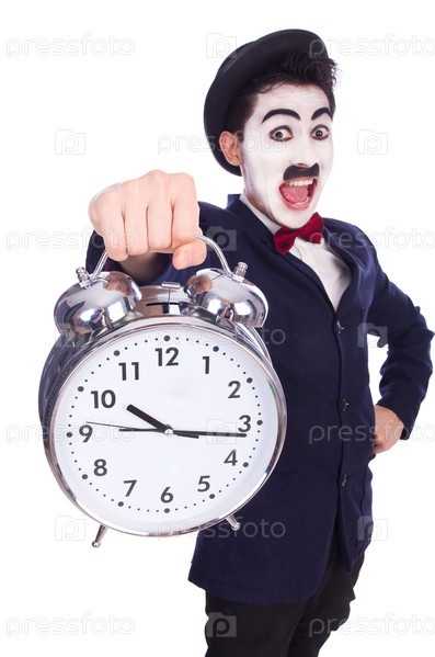 Забавный человек с часами на белом фоне
