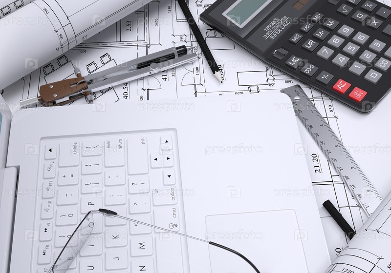 Калькулятор, чертежи и ноутбук