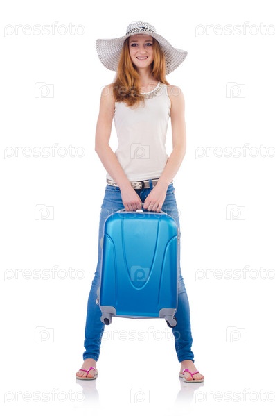 Девушка с чемоданами, изолированная на белом фоне