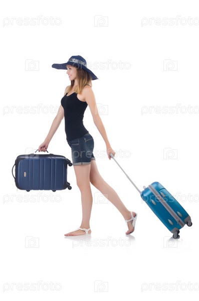 Девушка с чемоданами, изолированная на белом фоне
