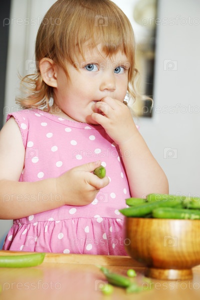 Девочка в платье в горошек ест горох