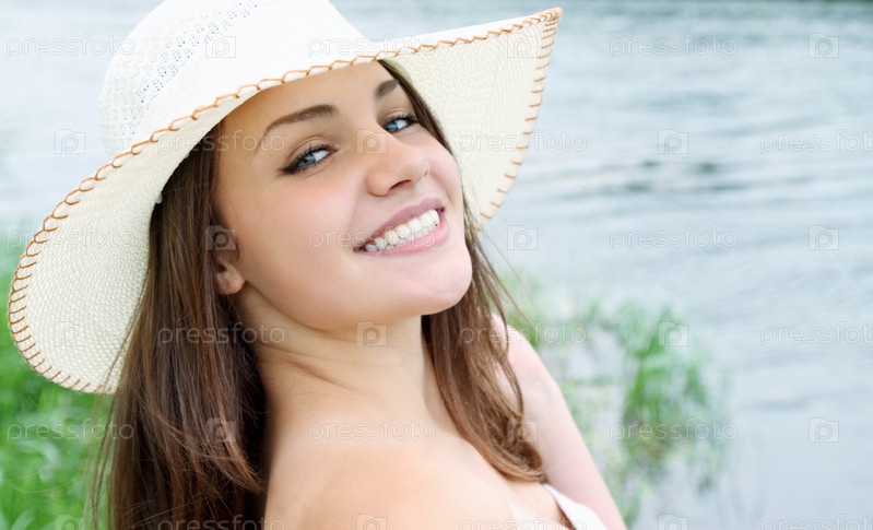 Красивая женщина в шляпе у реки