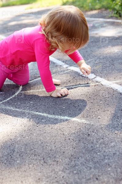 Маленькая девочка рисует большое солнце на асфальте