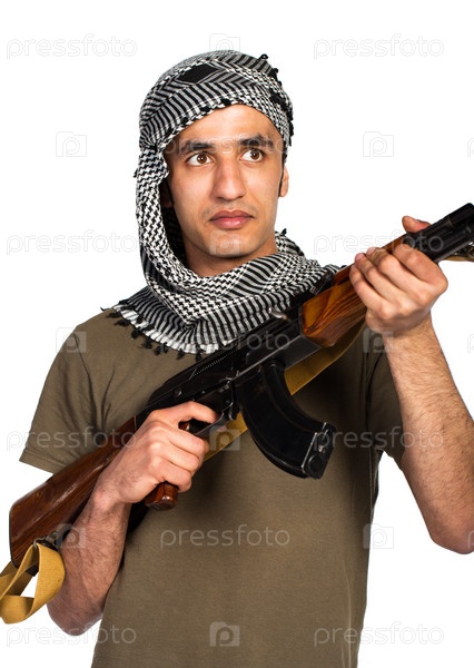 Араб в маскировочном костюме и куфии с автоматом на белом фоне
