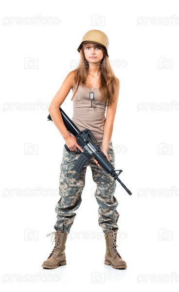Молодая красивая девушка солдат в камуфляже с автоматом в руке на белом фоне