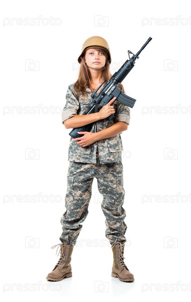 Молодая красивая девушка солдат в камуфляже с автоматом в руке на белом фоне