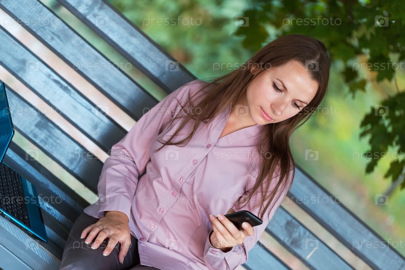 Бизнес-леди с мобильным телефоном и ноутбуком в парке
