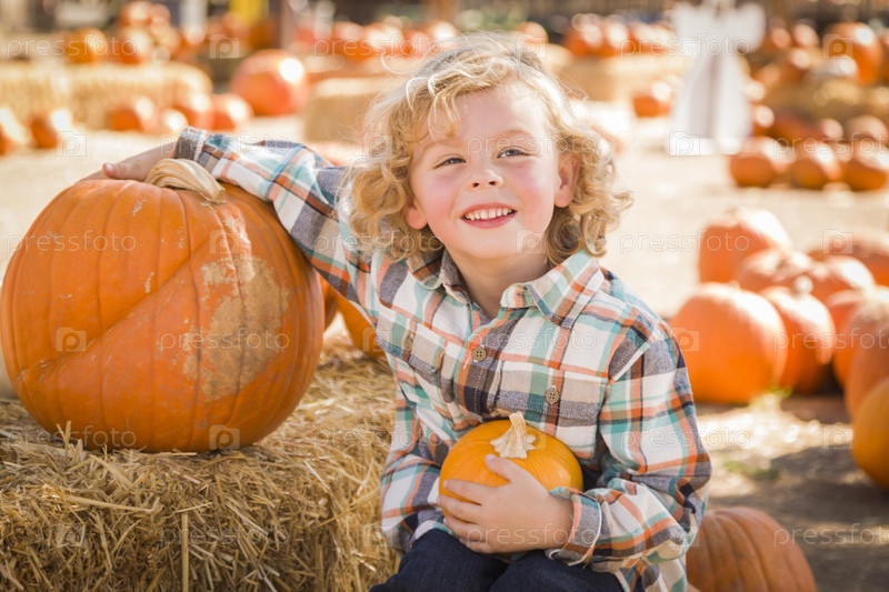 Мальчик с тыквой сидит на тыквенной ферме