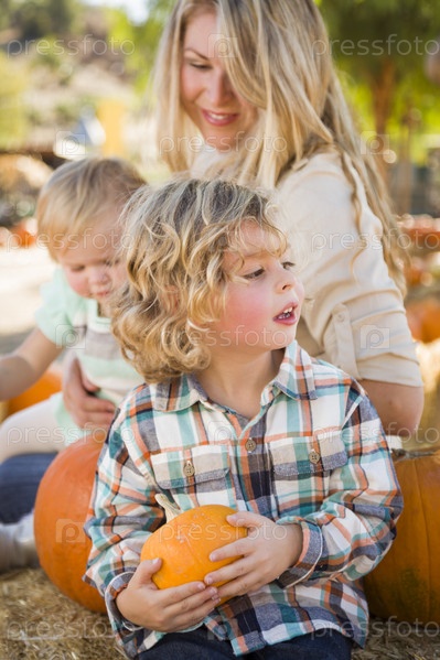 Молодая семья проводит день на тыквенной ферме