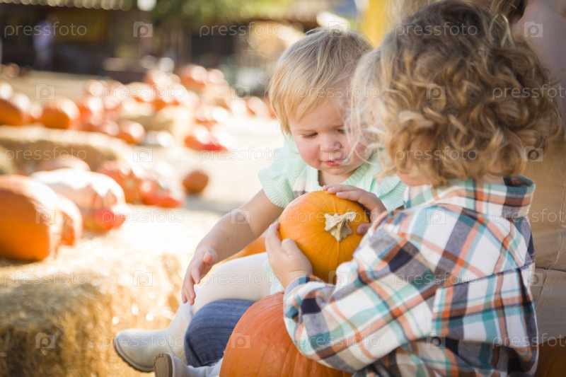 Молодая семья проводит день на тыквенной ферме
