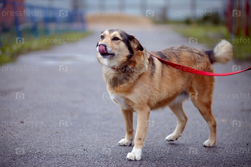 Рыжая беспородная собака на дороге