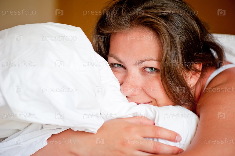 Молодая женщина обнимает подушку в постели