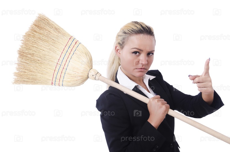 Бизнес-леди с метлой, изолированная на белом фоне