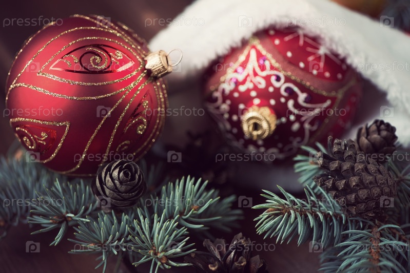 Елочные игрушки, ветви пихты и колпак Санты