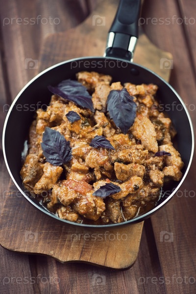 Жаркое из свинины с базиликом в сковороде на древесине