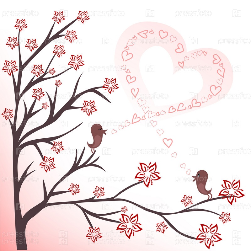 Две влюбленные птички на цветущей ветке поют песню