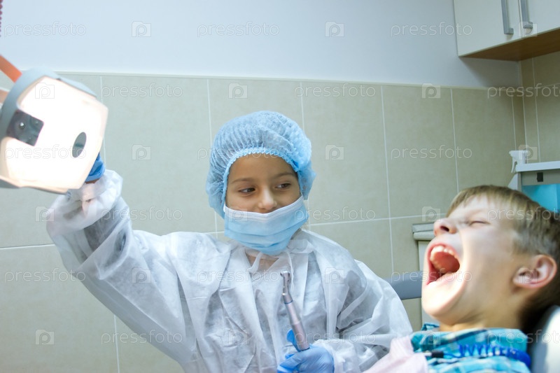 Пара детей играет у дантиста