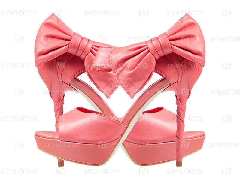 Вечерние розовые туфли с бантами на высоком каблуке. Коллаж