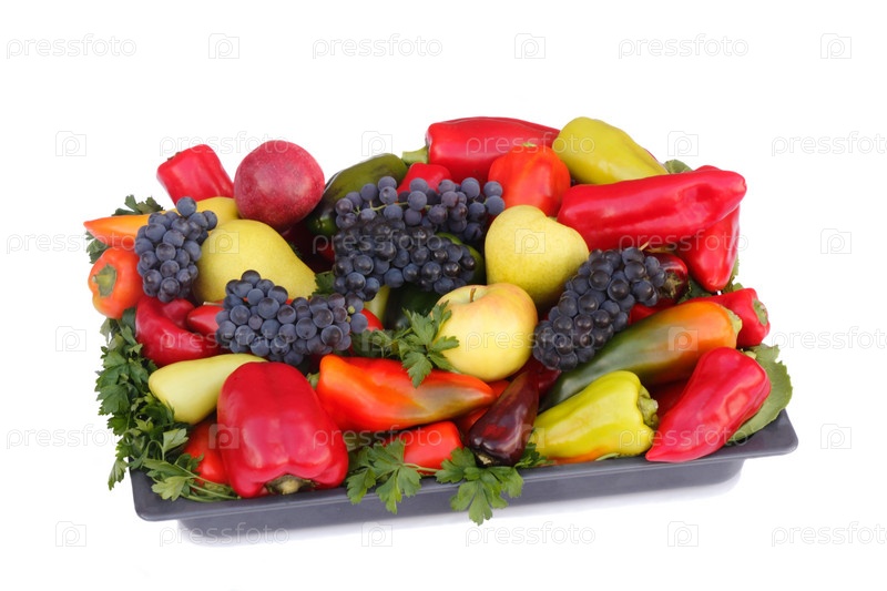 Фрукты, перец и петрушка листья на тарелке на белом фоне