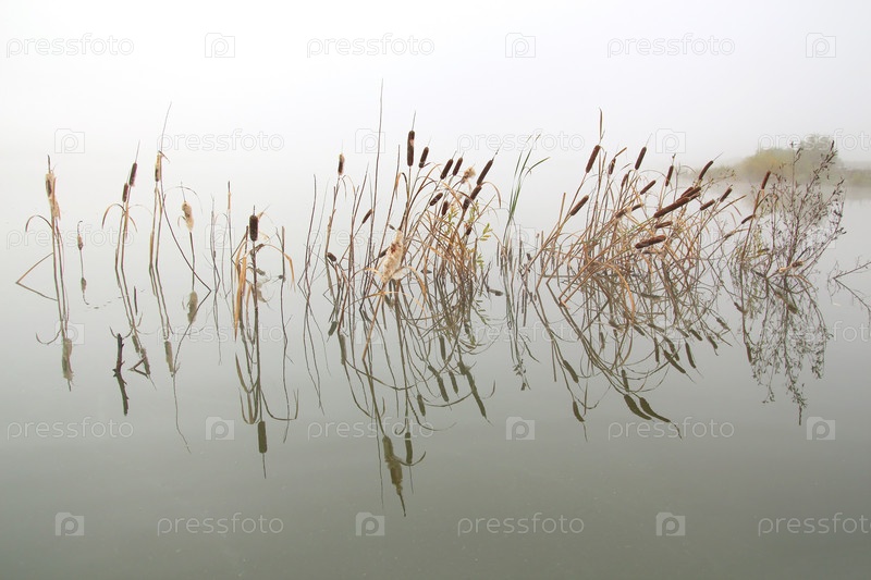 Пейзаж со стеблями камыша, отражающихся в воде