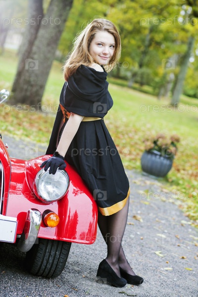 Женщина в черном позирует со старинным автомобилем