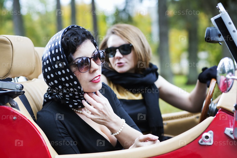 Женщины с темных очках и шарфах в ретро-автомобиле