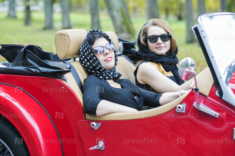 Женщины с темных очках и шарфах в ретро-автомобиле