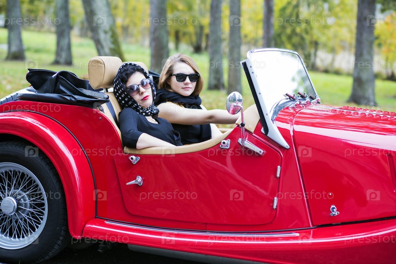 Женщины с темных очках и шарфах в ретро-автомобиле
