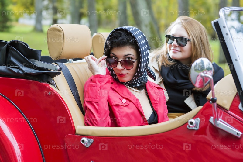 Женщины с темных очках и шарфах в ретро-автомобиле