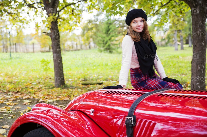 Женщина позирует со старинным красным автомобилем