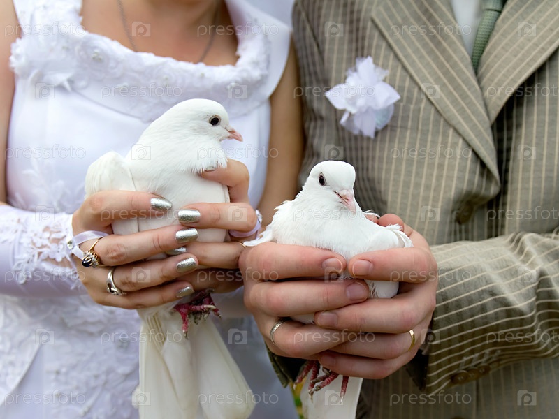 Свадебные голуби в руках невесты и жениха