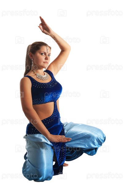 Девушка танцует восточный танец на белом фоне