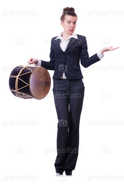 Бизнес-леди с барабаном, изолированная на белом фоне