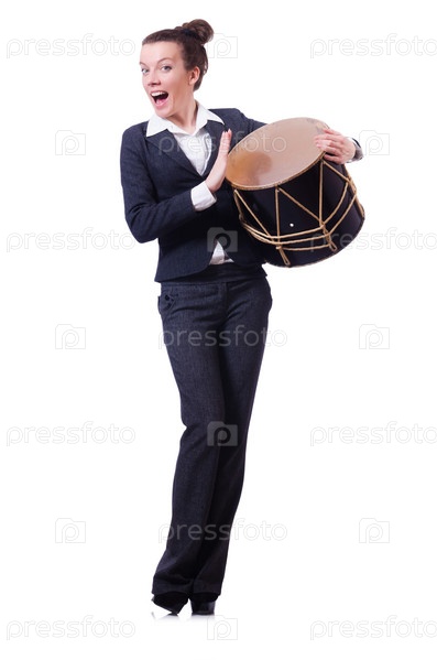 Бизнес-леди с барабаном, изолированная на белом фоне