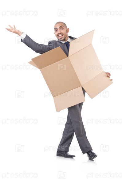 Бизнесмен с коробками, изолированный на белом