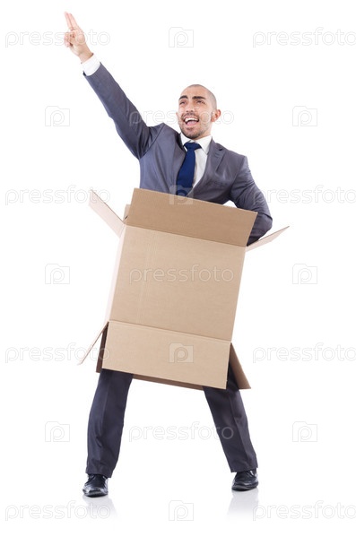 Бизнесмен с коробками, изолированный на белом