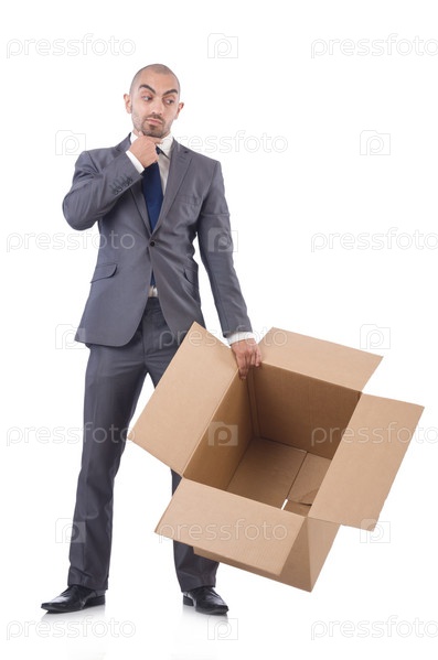 Бизнесмен с коробками, изолированный на белом