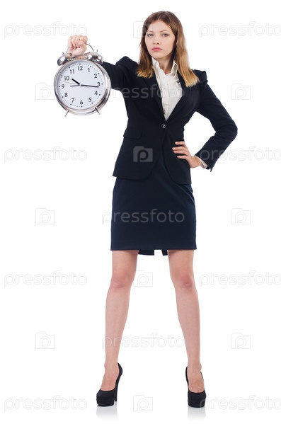 Бизнес-леди с часами, изолированная на белом фоне