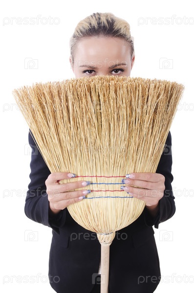 Бизнес-леди с метлой, изолированная на белом фоне