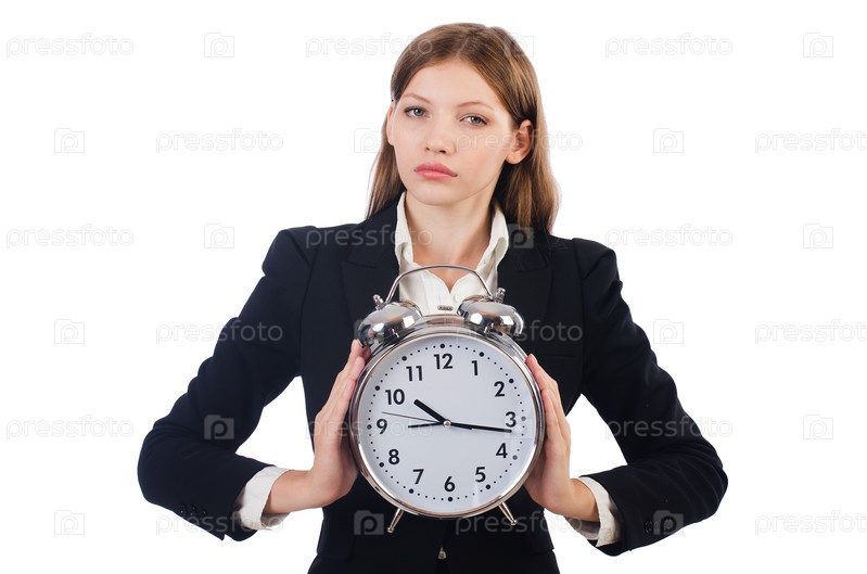 Бизнес-леди с часами, изолированная на белом фоне