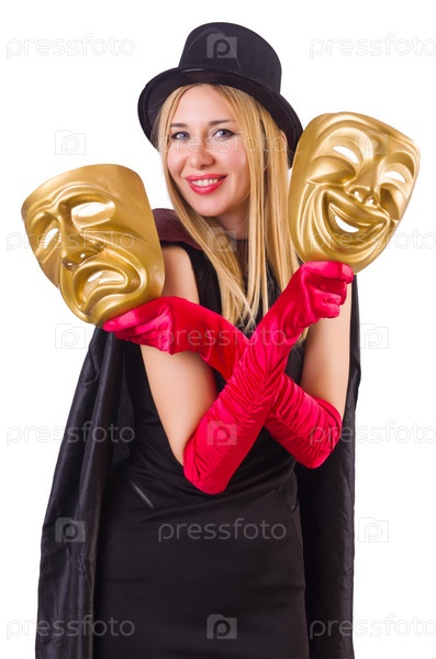 Женщина с двумя масками, изолированная на белом фоне