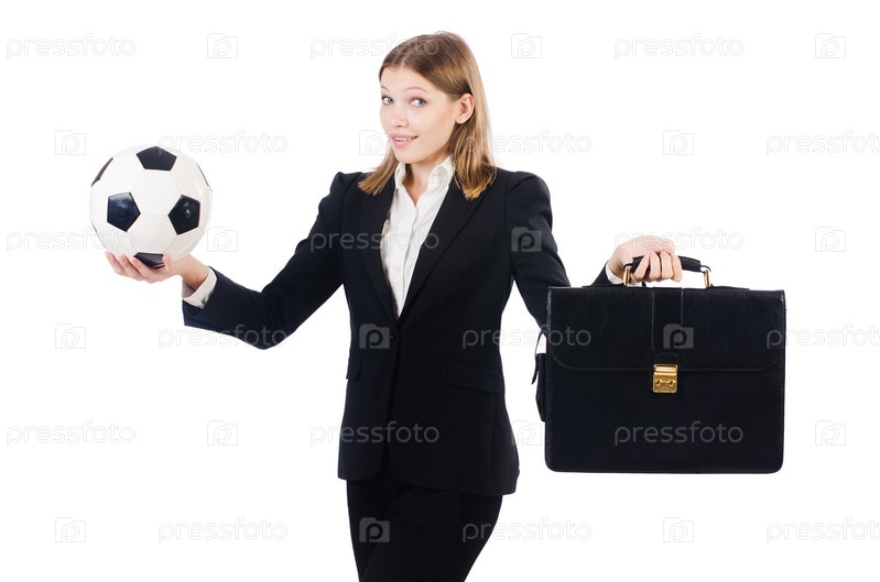 Бизнес-леди с футбольным мячом на белом фоне