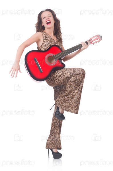 Женщина в леопардовом костюме с гитарой