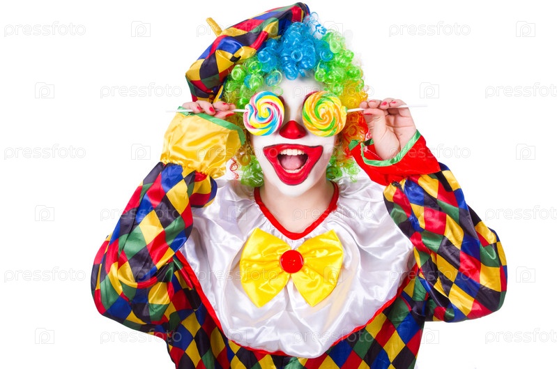 Клоун с леденцами, изолированный на белом фоне