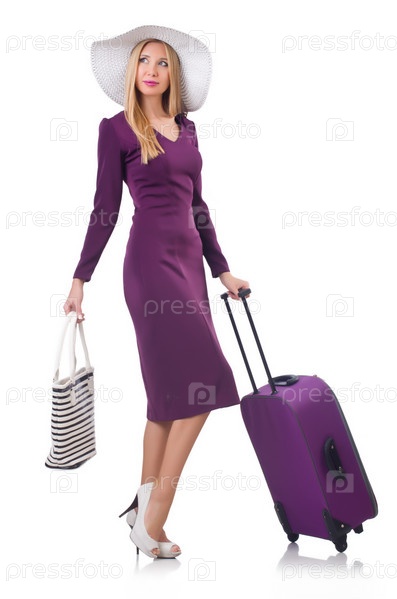 Девушка с чемоданами, изолированная на белом фоне